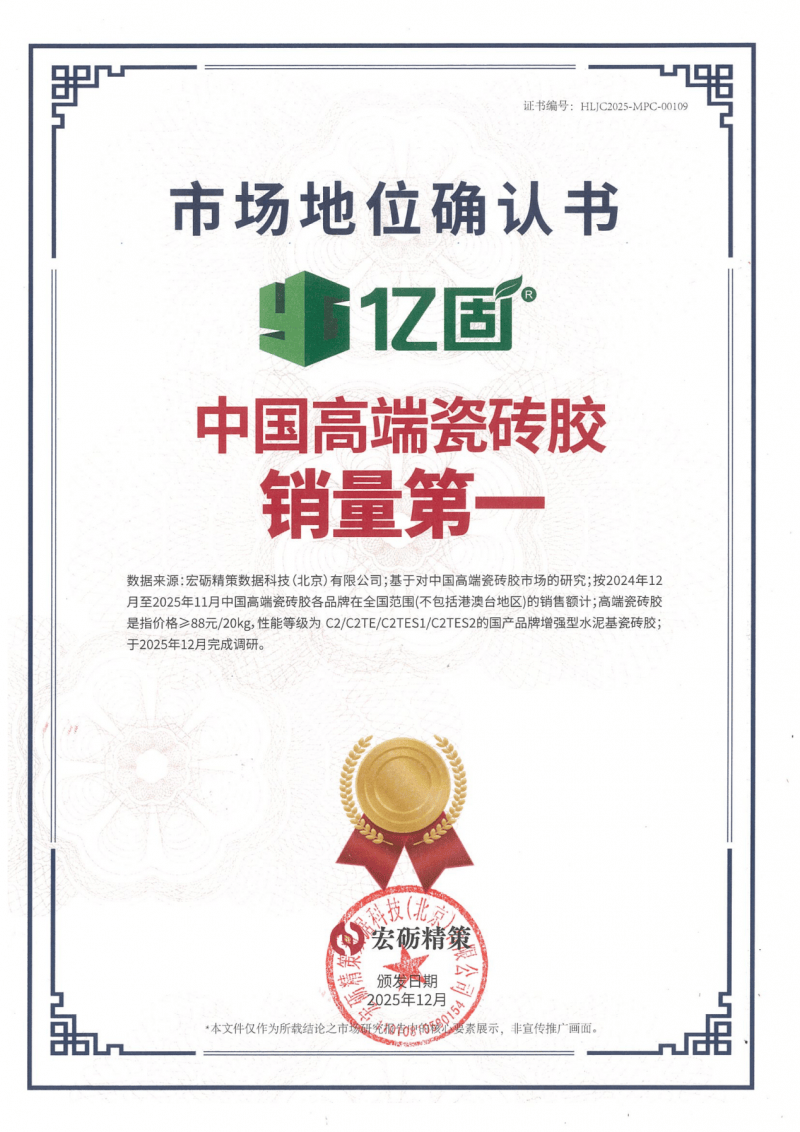 2025年底,权威调研机构尚普咨询集团的一纸认证,确认了亿固金钢瓷砖胶“中国首家质保50年瓷砖胶品牌”的地位。几乎同时,另一项“中国高端瓷砖胶销量第一”的认证也花落亿固。