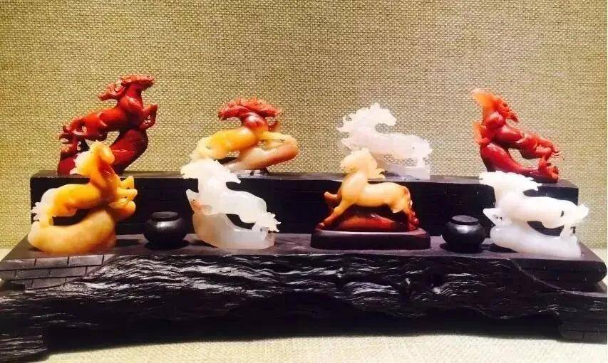 这件《骏马奔腾》组雕,是寿山多品种石雕刻的精品之作,甄选红芙蓉、汶洋石、杜陵石等数种寿山名石为原料,色彩涵盖朱红、明黄、凝白,天然石色与骏马意象浑然相融,尽显寿山石 “一石一色、一品一韵” 的独特魅力。